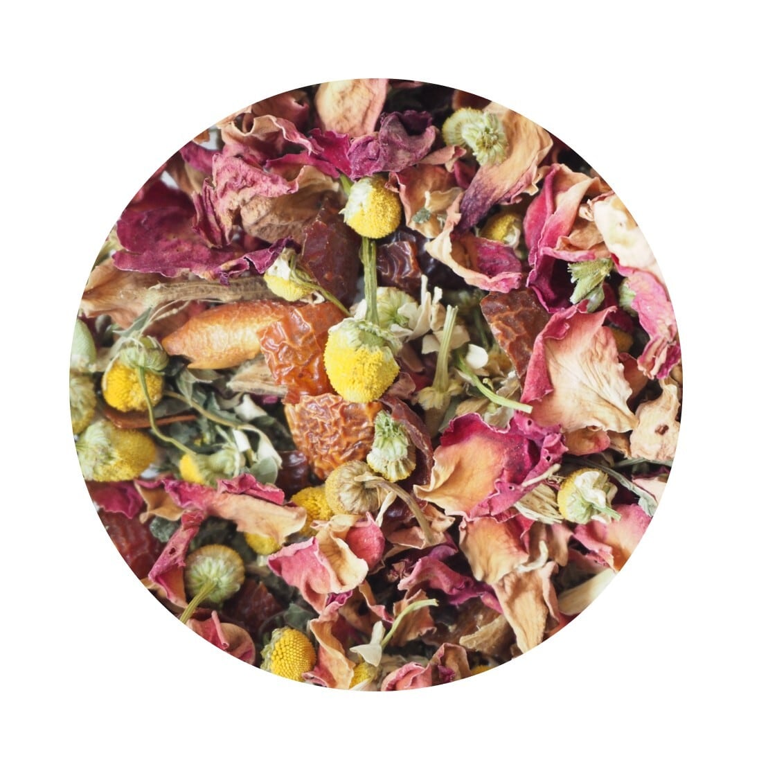 原材料:ローズヒップ、ジャーマンカモミール、ローズ、レモンバーム、リコリス
